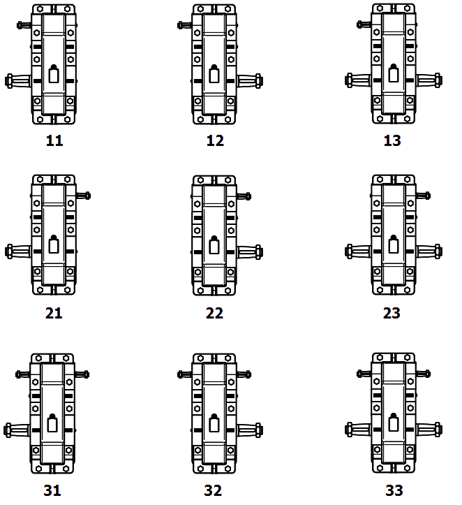 | Тип | Межосевое расстояние тихоходной ступени | Передаточное число | Схема сборки | Форма конца выходного вала | Климатическое исполнение и категория размещения |