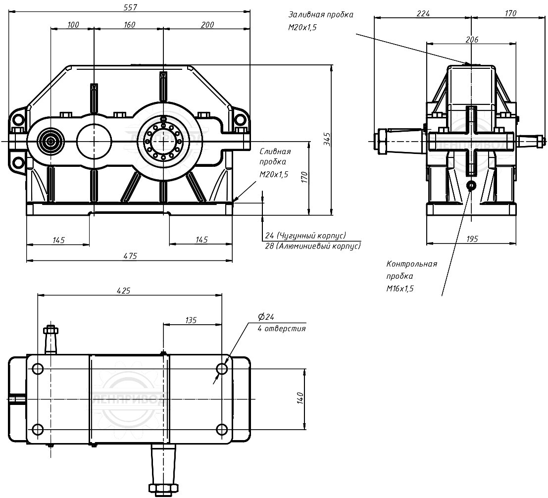 Цилиндрический двухступенчатый горизонтальный редуктор 1Ц2У-160 — один из самых часто используемых редукторов серии 1Ц2У. Эвольвентное зацепление с увеличенным модулем зуба позволяет обеспечить достаточный запас мощности и гарантировать долгий срок службы редуктора при соблюдении паспортных требований к нагрузкам и обслуживанию. Следует обратить внимание, что корпус может быть изготовлен как из алюминиевого сплава, так и из серого чугуна СЧ20.